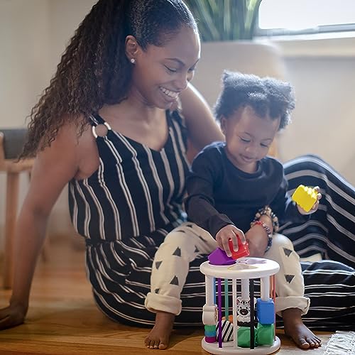 Die bunten, texturierten Formen, Spiegel und Schiebeperlen bieten verschiedene Reize, während sich die Bausteine einfach im Sortierer aufbewahren lassen. Das Material ist BPA-frei und das Set ist handwaschbar.