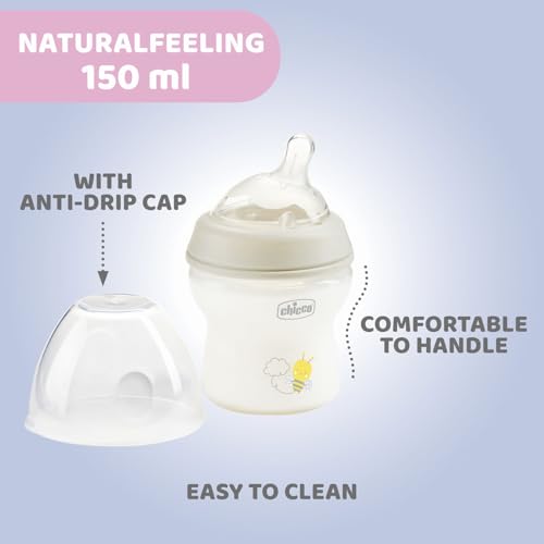 Im Set sind drei Kunststoffflaschen in verschiedenen Größen enthalten: 150 ml, 250 ml und 350 ml. Die Chicco NaturalFeeling Babyflaschen sind mit einem doppelten Anti-Kolik-Ventil ausgestattet, welches das Verschlucken von Luft verhindert und somit kolikbedingten Beschwerden vorbeugt. Die weichen und samtigen Silikonsauger simulieren das Stillen, was den Übergang zwischen Brust und Flasche erleichtert und ein natürliches Gefühl beim Trinken vermittelt.
