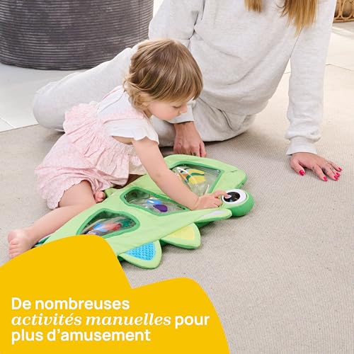 Der aufblasbare Körper wird mit Wasser gefüllt und bietet zusammen mit Luftkammern eine weiche, angenehme Unterlage – ideal für die Bauchlage. Verschiedene Materialien, Texturen und interaktive Elemente regen die Sinne an und fördern die motorische Entwicklung. Im Inneren schwimmen bunte Formen, die das Kind bewegen, beobachten und später gezielt sortieren kann. So werden mit zunehmendem Alter auch logische Fähigkeiten, Farb- und Formerkennung unterstützt.