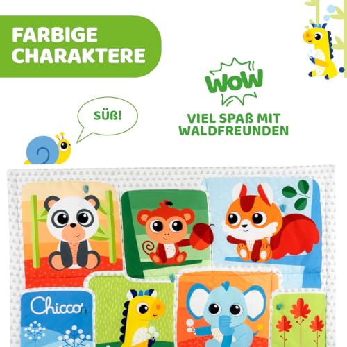 Der Chicco XXL Zauberwald Spielteppich bietet Babys ab Geburt eine extra grosse, weich gepolsterte Spielfläche für die ersten Bewegungen auf Rücken und Bauch. Mit seinem farbenfrohen Waldtier-Design weckt der Teppich die Neugier, lädt zum Entdecken ein und unterstützt freies Spielen im Alltag – zu Hause im Wohnzimmer oder im Kinderzimmer.