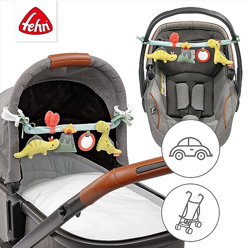 Die Fehn Kinderwagenkette Happy Dino ist ein liebevoll gestaltetes Babyspielzeug zum Aufhängen, das sowohl Zuhause als auch unterwegs für beste Unterhaltung sorgt. Mit fröhlichen Dinosaurier-Figuren, verschiedenen Geräuschen und spannenden Materialien regt sie Babys Sinne an und fördert gezielt die motorische Entwicklung von Geburt an.