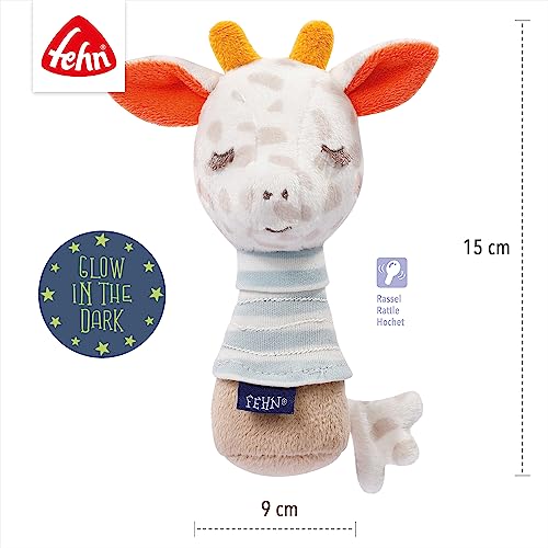 Die Fehn Stabrassel Giraffe ist ein handlicher Stabgreifling mit integrierter Rassel und einer „Glow-in-the-dark“ Bestickung. Sie wurde für die kleinsten Entdecker gestaltet und bietet verschiedene taktile sowie akustische Reize.