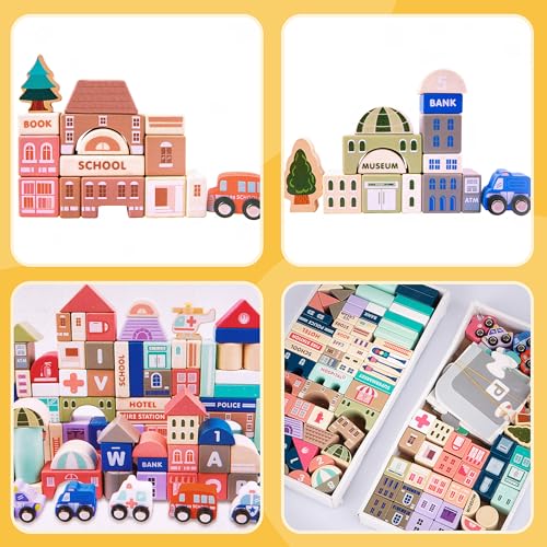 115 bunte Holzbausteine mit Puzzle-Matte und Aufbewahrungsbeutel, ideal für Kinder ab 3 Jahren zur Stadtgestaltung.