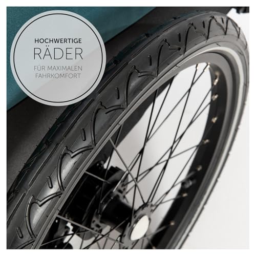 Dank des robusten Aluminiumrahmens, der XL-Lufträder hinten und dem schwenkbaren Vorderrad genießen Kinder wie Eltern höchsten Fahrkomfort. Zwei Kinder ab 6 Monaten bis jeweils 22 kg oder einer Körpergröße von 120 cm finden im Anhänger bequem Platz und sind durch das 5-Punkt-Gurtsystem sicher angeschnallt.