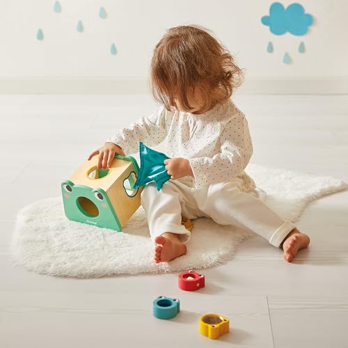 - Umfassendes Set: 1 Regenmacher in Wolkenform, 1 Pyramide aus 3 Pappteilen, 1 Steckpuzzle mit Seerose, 2 Entenfiguren, 1 Formsortierer mit 3 Fröschen, strukturierte Stoffelemente