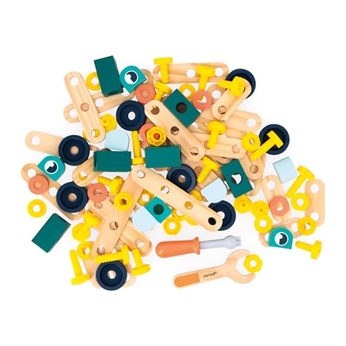 Das Set umfasst eine Vielzahl von Komponenten, darunter 28 Platten, 8 Räder, 6 Unterlegscheiben, 4 Augen, 10 Holzblöcke, 10 Bolzen, 14 Einsätze, 18 Schrauben, einen Schraubendreher, einen Schraubenschlüssel und die Vorlagenkarten. Hergestellt aus FSC-zertifiziertem Holz und hochwertigen Kunststoffen, sorgt Janod für ein sicheres und langlebiges Spielvergnügen. Mit einer Größe von 22 x 20 x 25 cm ist das Set kompakt und ideal für Kinderhände.