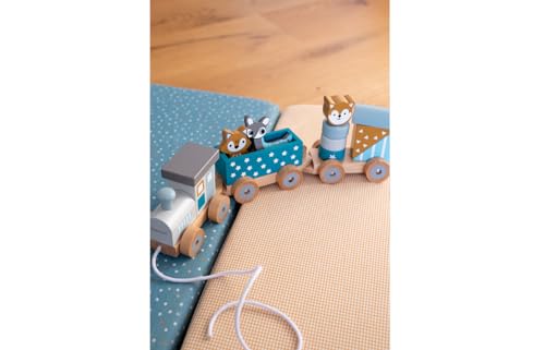 Die Kindsgut Holz-Eisenbahn kombiniert klassisches Spielzeug mit modernem, stilvollem Design in dezenten Farben. Der Zug besteht aus einer Lokomotive, zwei Waggons, mehreren Holzbausteinen und liebevoll gestalteten Zoo-Tieren – insgesamt 12 Teile.