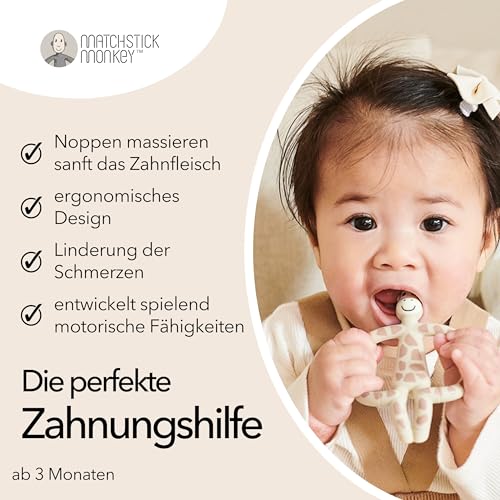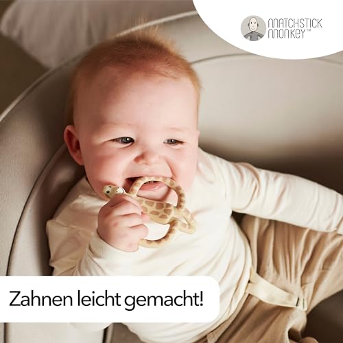 Ein stilvolles, sicheres und funktionales Zahnungsspielzeug – mit dem Matchstick Monkey Beissring in Giraffenform wird jede Zahnungsetappe für dein Baby angenehmer und entspannter.