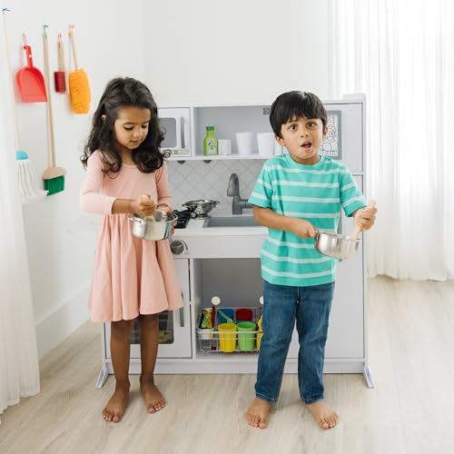 Dieses 8-teilige Kochgeschirr-Set aus poliertem Edelstahl enthält Pfannen, Töpfe, ein Sieb, Holz-Kochlöffel und -Pfannenwender sowie ein praktisches Gestell für einfache Aufbewahrung. Ideal für fantasievolles Rollenspiel.