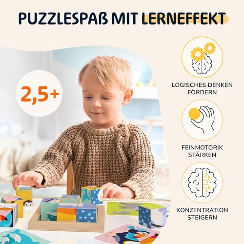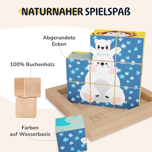 Das Merle Toys® 6-in-1 Würfelpuzzle ist ein liebevoll gestaltetes Lernspielzeug für Kinder ab 2 Jahren. Hergestellt aus 100 % nachhaltigem Buchenholz, bietet es sechs spannende Tiermotive aus unterschiedlichen Lebensräumen. Die 4,5 cm grossen Bilderwürfel liegen perfekt in kleinen Kinderhänden und fördern spielerisch logisches Denken, Feinmotorik und Konzentration.