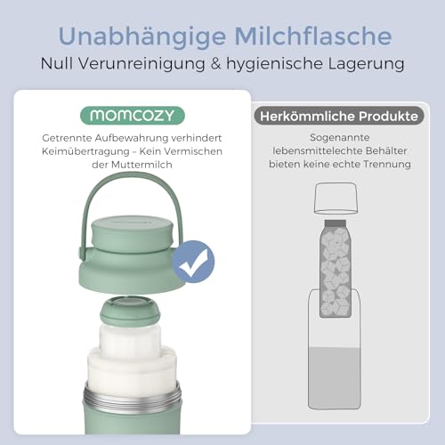 Der Kühler kommt mit zwei 330 ml Aufbewahrungsflaschen, die über ein Trennsystem verfügen. Diese Funktion ermöglicht eine getrennte Lagerung von frisch abgepumpter und gekühlter Milch, wodurch Kreuzkontaminationen verhindert werden. Zudem ist der Momcozy Kühler einfach zu reinigen und steril zu halten, da er mit gängigen Sterilisationsgeräten kompatibel ist und das Innenfach spülmaschinenfest ist.