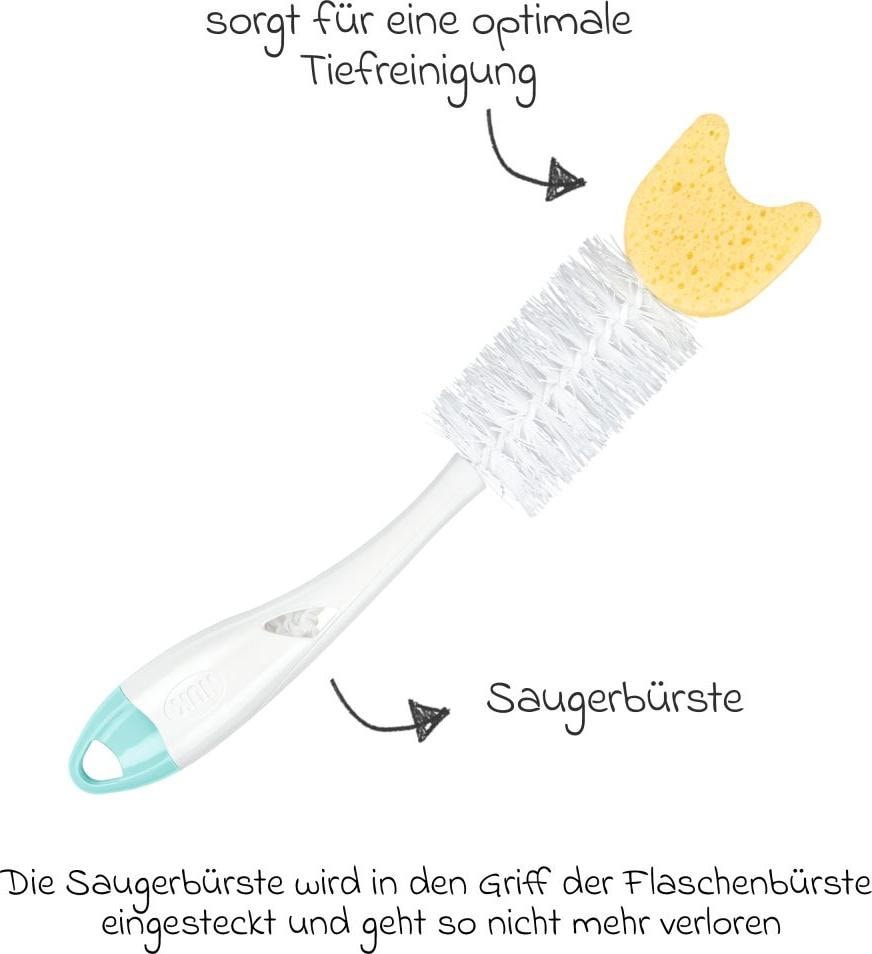 - Schwamm am Ende der Bürste – entfernt zuverlässig Milchreste und Ablagerungen