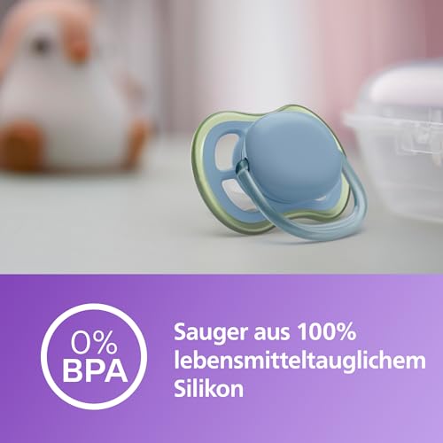 Der Philips Avent Ultra Air Schnuller wurde speziell für Neugeborene und Babys bis zu 6 Monaten entwickelt. Er vereint Komfort, Hygiene und optimale Mundentwicklung in einem hochwertigen Produkt. Das ultraleichte Design mit extra grossen Belüftungslöchern sorgt für maximale Luftzirkulation, sodass die empfindliche Haut des Babys geschont wird. Der weiche, strukturierte Silikonsauger ist kiefergerecht geformt und von 98 % der Babys anerkannt.*
