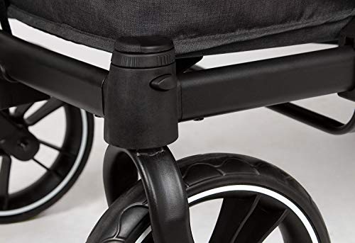 Die gepolsterte Ladefläche bietet nicht nur Platz für bis zu zwei Kinder, sondern auch für andere Gegenstände wie Spielzeug oder Grillzubehör. Der Wagen hat eine maximale Belastbarkeit von 70 kg, wobei jeder Sitz für Kinder bis zu 22 kg geeignet ist. Ein zusätzlicher Sitz, Adapter für Babyschalen und weiteres Zubehör können separat erworben werden. Das faltbare Sonnendach mit UV-Schutz 50+ schützt die Kinder an warmen Tagen vor direkter Sonneneinstrahlung und sorgt durch die Mesh-Sichtfenster für eine optimale Luftzirkulation.