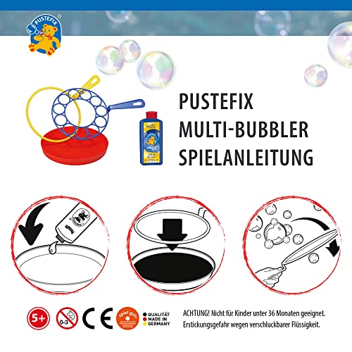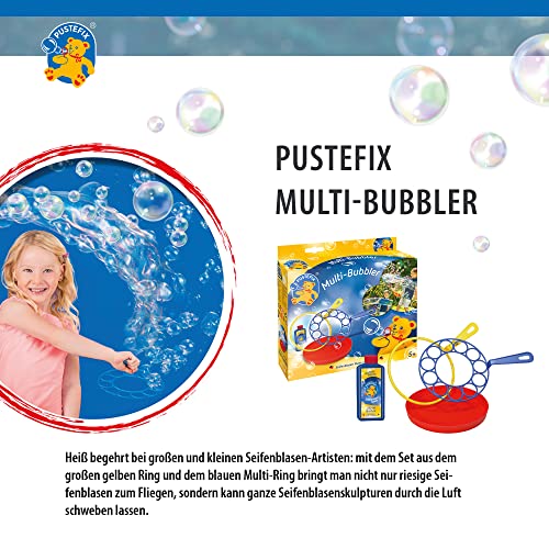 Mit dem vierteiligen Seifenblasen-Set Multi-Bubbler von Pustefix wird das Spielen im Freien für Kinder zum unvergesslichen Erlebnis. Das Set beinhaltet alles, was man braucht, um beeindruckende Seifenblasenskulpturen in die Luft zu zaubern. Es eignet sich für Kinder ab 5 Jahren und besteht aus einem Uni-Ring, einem Multi-Ring, einer Flüssigkeitsschale und einer Nachfüllflasche mit 250 ml Seifenblasenflüssigkeit.