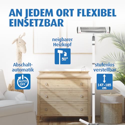 Für Sicherheit sorgen eine Kippsicherung, die den Strahler bei zu starker Neigung automatisch ausschaltet, und ein integrierter 10-Minuten-Timer, der Überhitzung vorbeugt. Der Zugschalter ermöglicht ein bequemes Ein- und Ausschalten, auch hinter dem Wickeltisch.