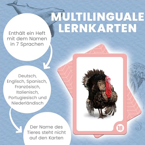 - Anzahl Karten: 50 Bildkarten mit realen Tierfotos.