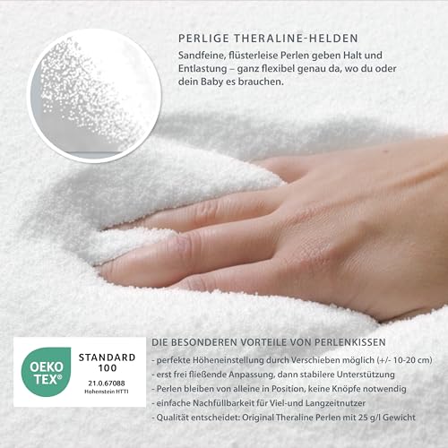 Das Stillkissen mit Perlenfüllung von Theraline ist der ideale Begleiter für Mütter und Babys in den ersten Lebensmonaten. Mit einer Länge von ca. 190 cm und einer Breite von ca. 35 cm bietet es ausreichend Platz und Unterstützung beim Stillen. Die Füllung aus EPS-Perlen sorgt dafür, dass sich das Kissen perfekt an die Körperform anpasst, was sowohl für die Mama als auch für das Baby einen hohen Komfort gewährleistet.