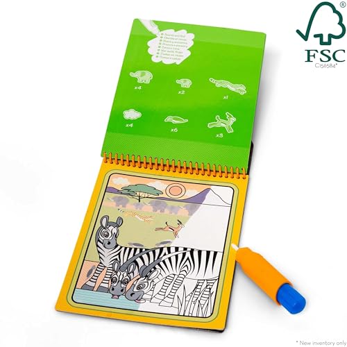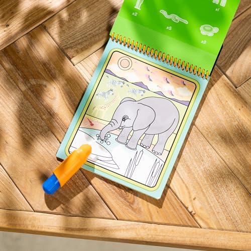 Dieses wiederverwendbare Wassermalbuch mit Spiralbindung enthält vier liebevoll gestaltete Safari-Motivseiten, die beim Malen mit dem beiliegenden nachfüllbaren Wasserstift zum Leben erwachen.